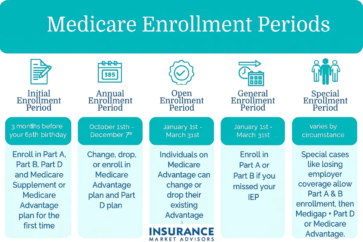 • Annual Enrollment Period (AEP): October 15 – December 7. You can switch between Original Medicare and Medicare Advantage, change Advantage plans, or update Part D coverage.